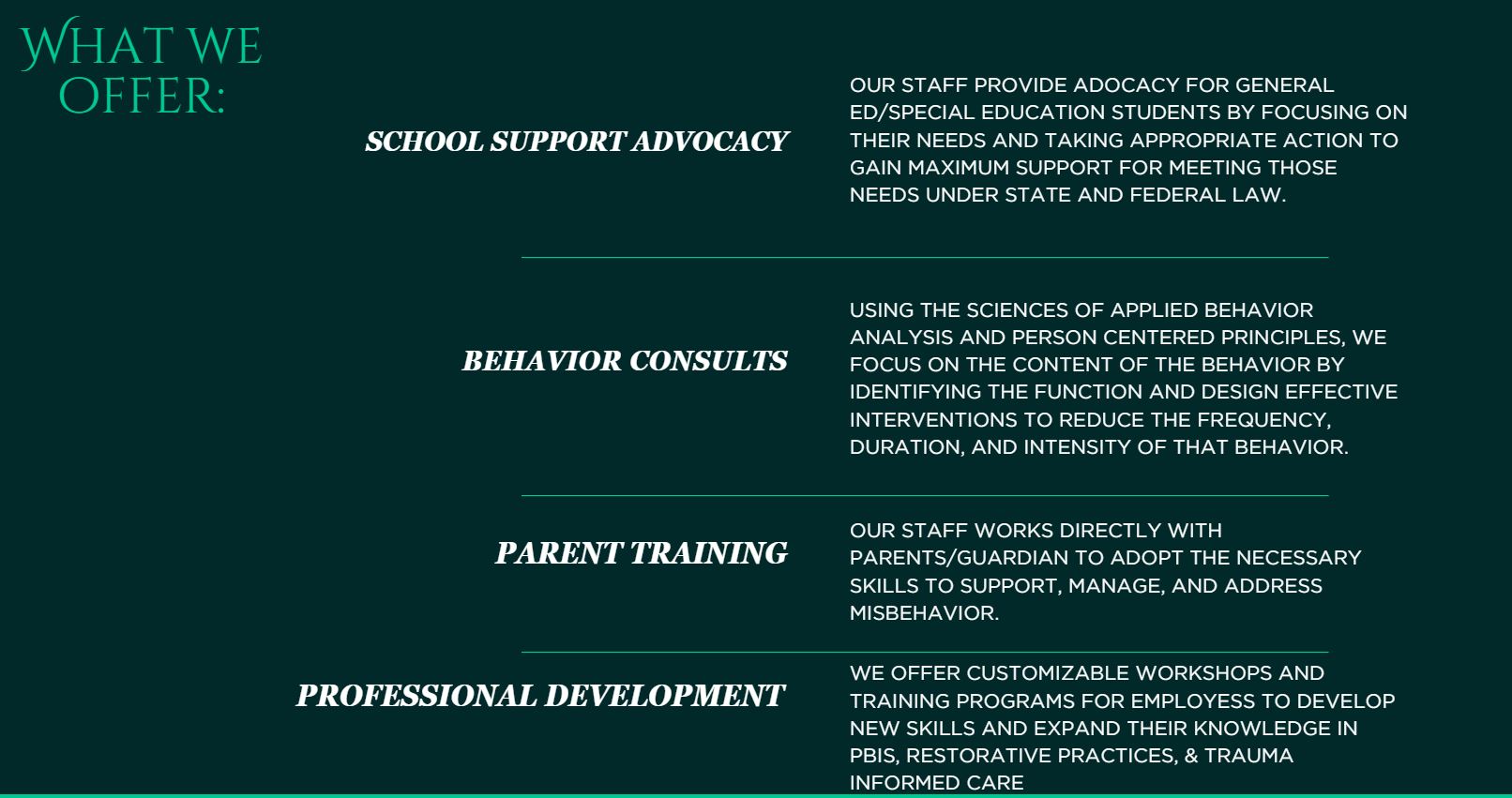 The Behavior Firm provides positive behavior supports to young children, adolescents, and adults. We use a positive, yet person centered approach that focuses on the whole person, not just the challenges that exist. We combine the principles of ABA and various evidenced-based practices to design effective interventions through consults and coaching that understands the whole person in order to achieve positive outcomes that improve quality of life.