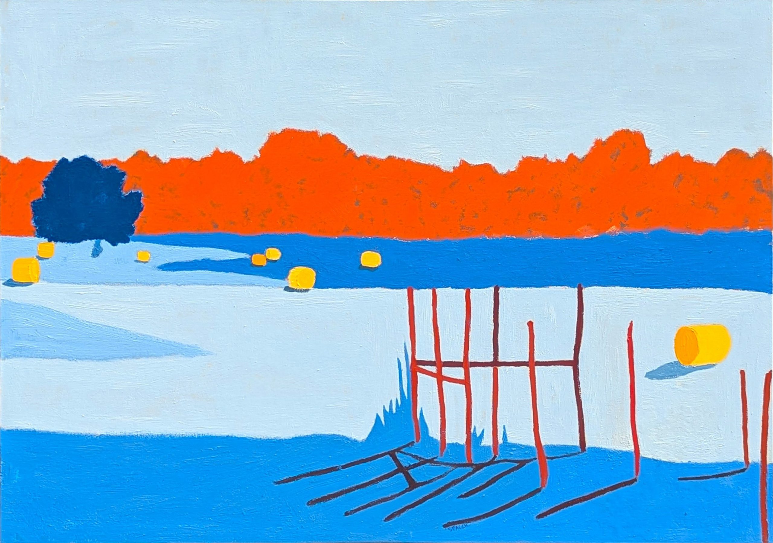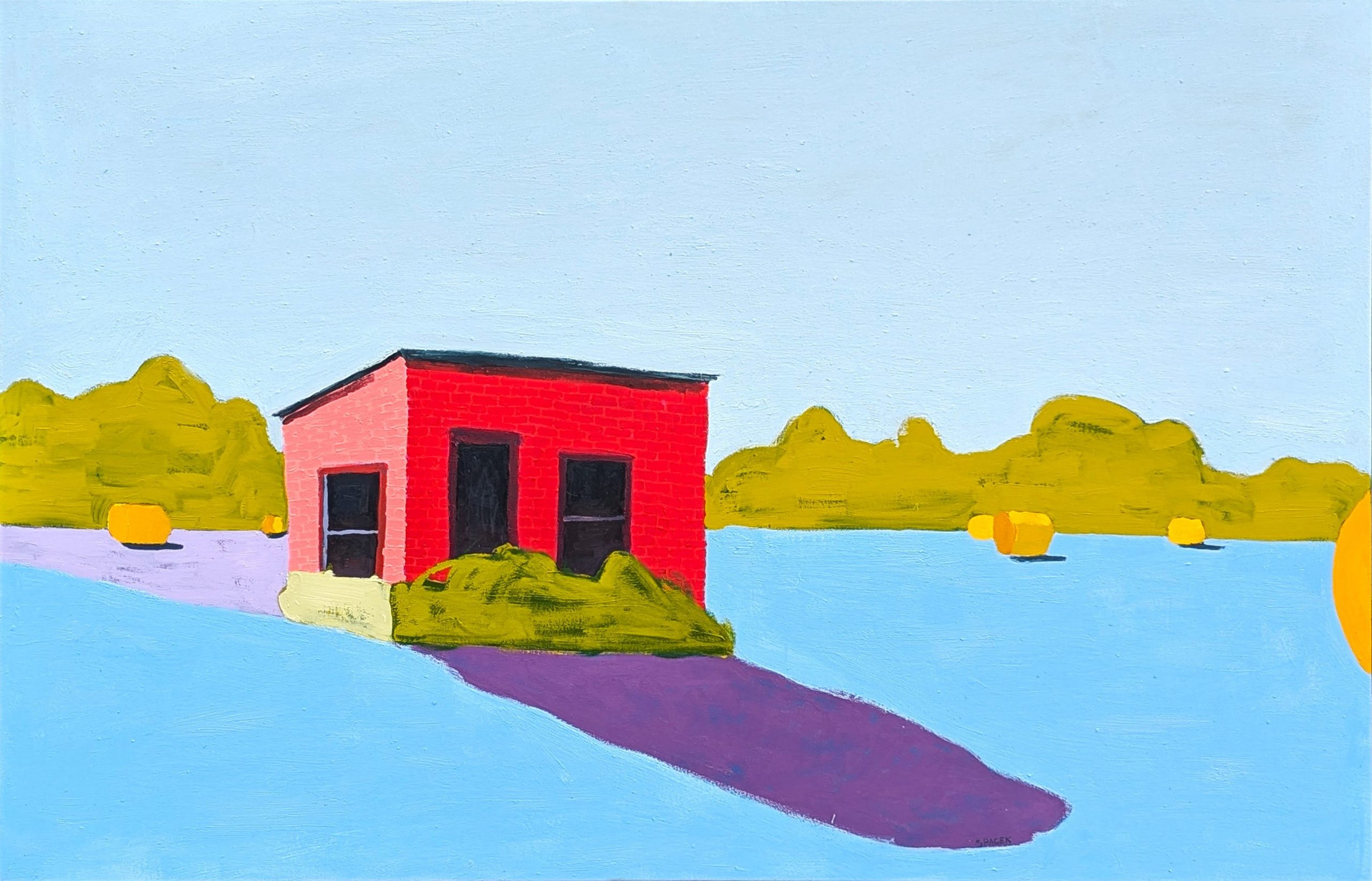 Not long after that realization, I switched my major to studio art and started leaning fully into my creativity. I quickly found my footing again and stood out in many of my classes. During a summer workshop through my university, I was invited to travel to England to study under Paul Wright, a brilliant painter from Leicester who’s still a good friend. I spent a month in his studio, watching firsthand what life looked like for a full-time working artist. His paintings were bold, emotional, and full of energy—and he created them at a pace that was almost machine-like. That experience stuck with me. One of the biggest takeaways was something he told me: “Your paintings aren’t special because you made them—they’re special because you make them special.” That mindset really changed how I work. It reminds me that every piece demands an extra level of intention. Sometimes that means staring at a painting for days, unsure if it’s finished. Sometimes it’s obsessing over a title. For Paul, he meant putting the same level of energy into each and every brush stroke and even mixing a special color for each mark. For me, with my American Rural series, that extra effort usually goes into creating a large number of color studies where I work and rework the shapes and colors many times before I even begin the final piece.