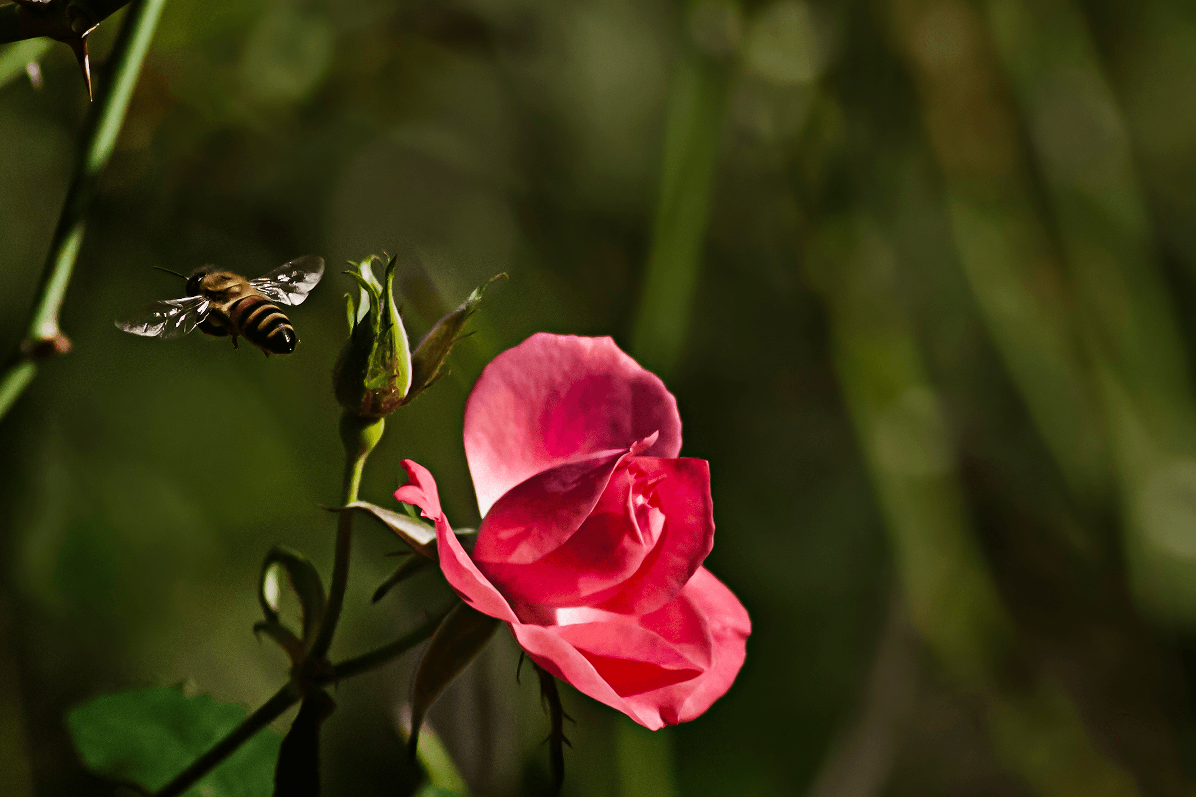 My neighbor is a landscape architect who plants beautiful flowers year-round. This rose was booming its heart out when a ray from the sun struck it from behind, backlighting it against a very dark background—my favorite subject for a photograph. It was much too cold for a bee to out, but there he was. I do not claim these special photographs as my own. I was in the right place at the right