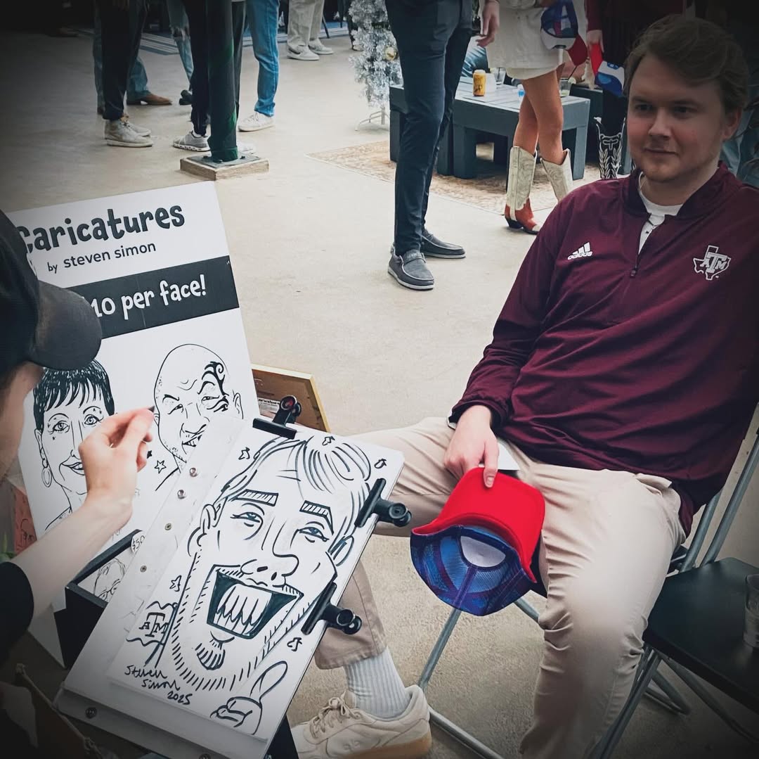 I’d dedicate my shoutout to my girlfriend, Elyssa, who’s supported me from the very beginning and often joins me at events as I continue to grow the business. I’m also grateful to my aunt and uncle, who encouraged me to get involved at church—while they imagined I might teach CCE, I decided to serve by drawing caricatures instead. And my education at Texas A&M University in Visualization has played a huge role as well, giving me a strong foundation in graphic design, branding, and web development that’s helped me build and promote the business professionally.